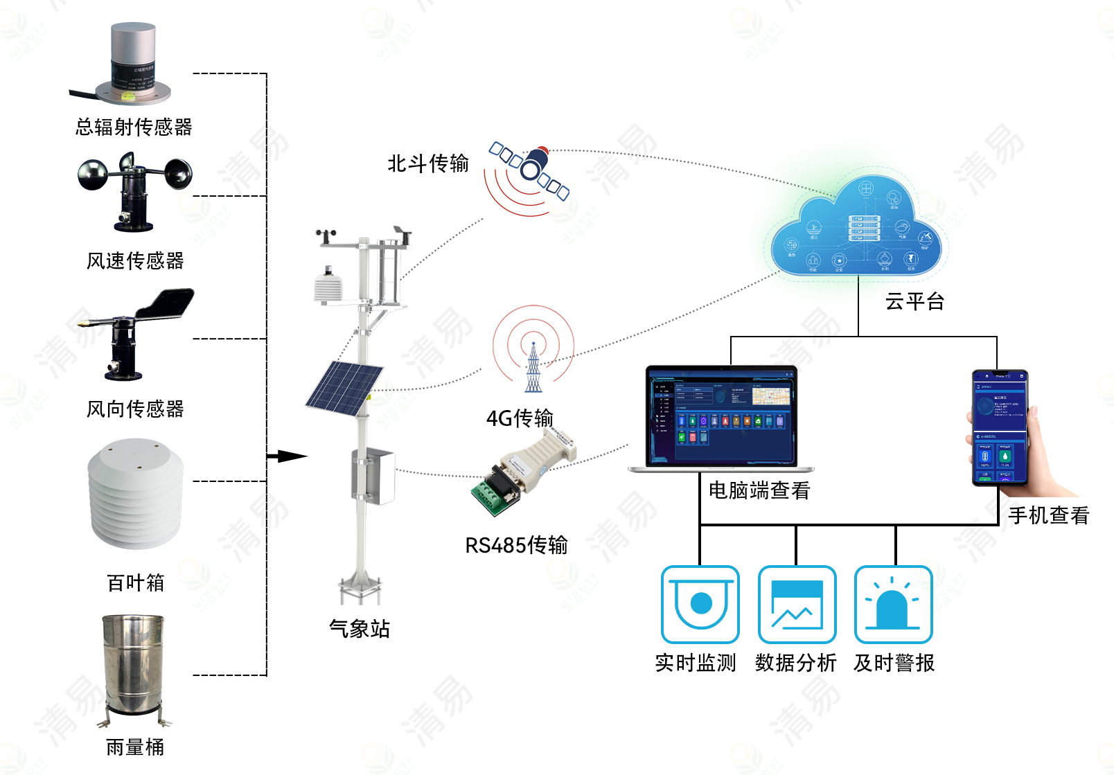 在瞬息万变的天气面前,准确的数据是决策的基石。无论是农田的灌溉时机、风电场的效率优化,还是校园的气象科普、城市的防灾预警,都需要可靠的气象信息作为支撑。以科技之力赋能“看得见、测得准、传得快、用得好”的新一代气象监测站,让"知天而作"变得简单。 ![]() 清易电子依托深厚技术积淀,打造了涵盖自动气象站、超声波气象站、手持式气象站和移动气象站等品类气象监测站系列产品,集准确监测、实时传输、稳定运行于一体,全面契合“观测即服务”的理念要求,以准确、可靠、实时的核心科技,提供可靠的气象数据解决方案。 ![]() 01 准确感知,数据可靠 采用高精度传感器与信号处理技术,对风速、风向、温度、湿度、大气压力、降雨量、光照辐射、紫外强度等关键气象要素进行毫厘必究的监测。数据稳定,经得起时间与环境的考验。 ![]() 02 坚韧实用,全天候守护 产品设计遵循严格的标准,主体材质耐腐蚀,防护等级高,能从容应对风霜雨雪、高温高湿等恶劣环境,真正实现无人值守。 ![]() 03 智慧物联,洞察先机 集成4G、北斗、LoRa、NB-IoT和以太网等多种数据传输方式,数据实时上传至云端平台。通过物联网云平台或定制化软件,您可查看实时数据、历史曲线,接收预警信息,让管理运筹帷幄。 ![]() 04 模块设计,灵活拓展 气象监测站系列产品采用标准化、模块化设计,支持根据应用场景灵活选配传感器,并轻松升级扩容,满足您当前与未来的多元化需求。 ![]() ![]() ![]() ![]() ![]() ![]() 05 双供电模式,长效续航 支持市电和太阳能+蓄电池组合双供电方案,市电优先,自动切换,解决野外、偏远地区长期供电难题,**降低部署与维护成本。 ![]() 01 多端实时查看 支持PC网页、手机APP查看,数据实时一手掌握。 ![]() 02 设备远程管理 可远程配置参数、诊断设备状态,可降低现场维护频率与成本。 ![]() 03 深度数据分析 自动生成日报、月报、年报,支持数据导出,图表化呈现,助力趋势研判与决策制定。 ![]() 04 自动预警通知 可自定义风速超限、暴雨来袭、温度骤变等报警阈值,及时通过短信、平台消息、邮件等方式接收警报。 ![]() ![]() 上一篇: 地表水环境监测解决方案